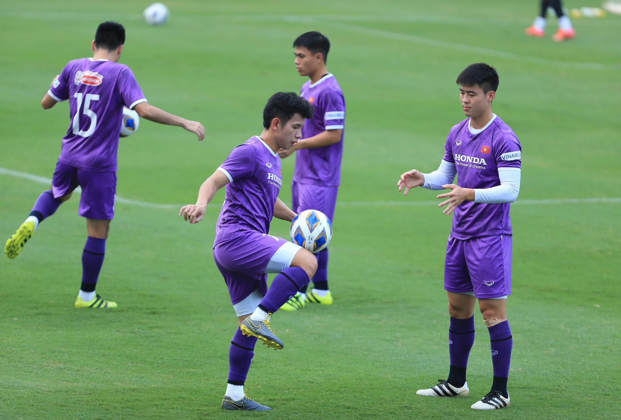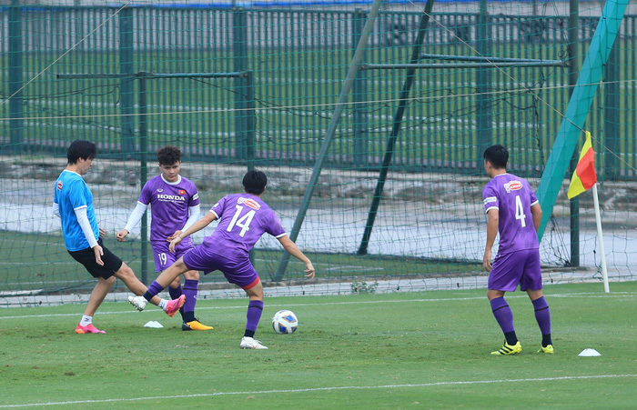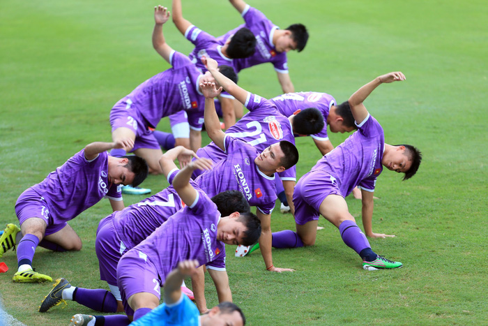 Nhóm cầu thủ tập ở một góc riêng gồm có: Tuấn Anh, Xuân Trường, Trọng Hoàng, Tiến Dũng, Quang Hải. Trong khi đó, Tiến Linh và Văn Hậu tiếp tục tập ở phòng gym với bác sĩ