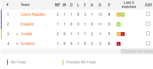 Với riêng Croatia, họ sẽ cần thắng Scotland làm điều kiện cần rồi chờ kết quả cặp Anh vs CH Séc để mong có vé trực tiếp vào vòng trong. Hoặc nếu không thể cạnh tranh vé trực tiếp, 4 điểm cũng sẽ giúp Croatia dễ là 1 trong 4 đội hạng ba xuất sắc nhất, vẫn có thể trụ lại giải.