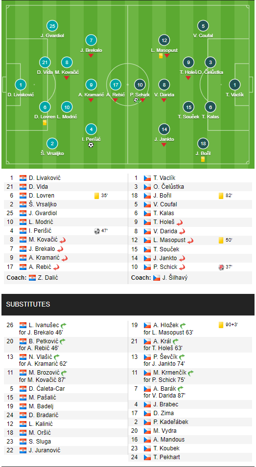 Hai đội chia điểm trong thế trận cân bằng, từ tỷ lệ kiểm soát bóng cho tới các pha hãm thành, dứt điểm. Tuy nhiên, CH Séc tạm vươn lên dẫn đầu bảng D với 4 điểm, còn Croatia mới có 1 điểm, đứng thứ ba.