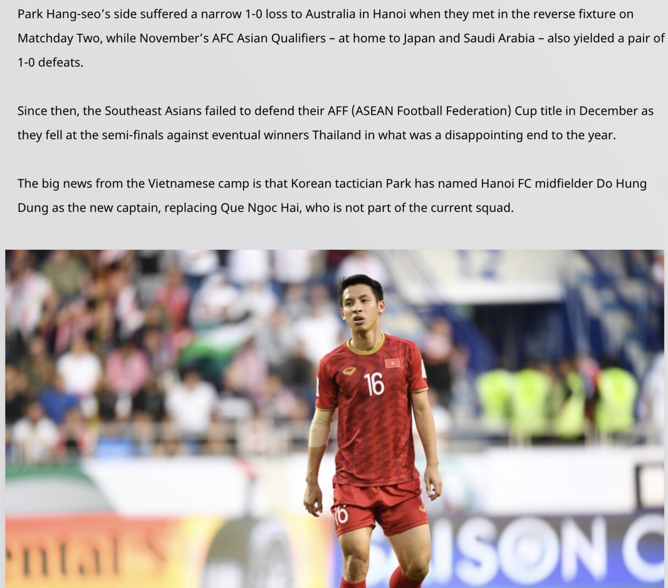 Thông tin đáng chú ý từ phía tuyển Việt Nam là chiến lược gia người Hàn Quốc đã bổ nhiệm tiền vệ Đỗ Hùng Dũng của Hà Nội FC làm đội trưởng mới, thay thế Quế Ngọc Hải, cầu thủ không có tên trong đội hình ở trận gặp Australia tới đây".