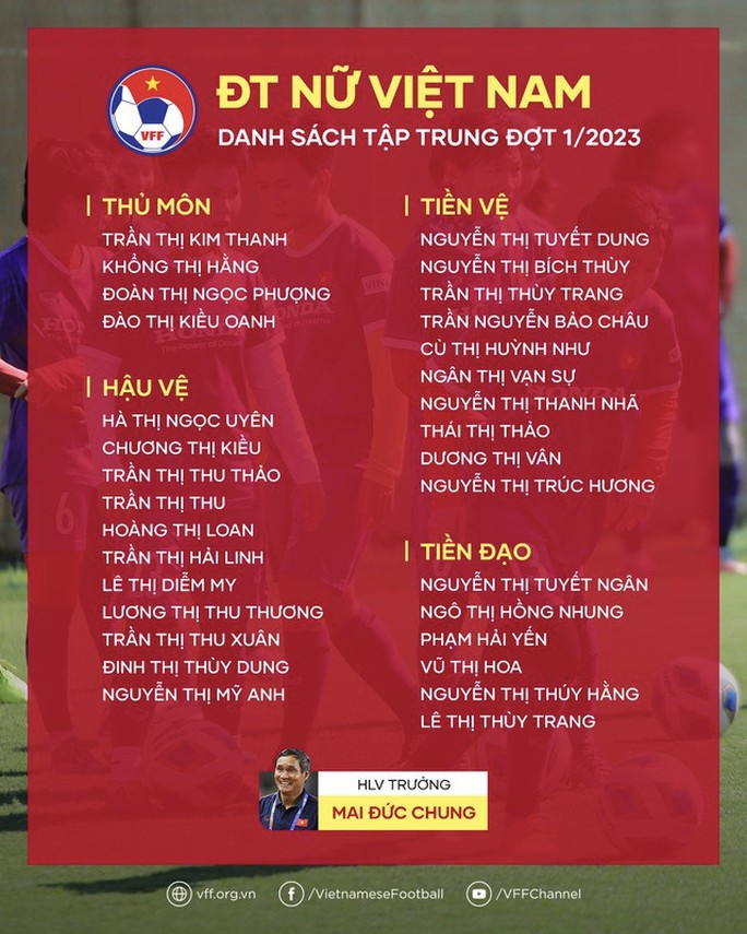 Để chuẩn bị cho giải đấu đầu tiên trong năm 2023 của đội tuyển nữ quốc gia, Liên đoàn bóng đá Việt Nam đã công bố danh sách triệu tập 31 cầu thủ và bắt đầu hội quân vào ngày 10-3. Thầy trò HLV Mai Đức Chung sẽ di chuyển đến Cẩm Phả, Quảng Ninh để rèn thể lực từ ngày 11 đến 18-3. Sau đó, toàn đội sẽ quay trở về Trung tâm đào tạo bóng đá trẻ Việt Nam (Hà Nội) để lắp ráp đội hình, rèn kỹ chiến thuật, xen kẽ là một số trận đấu giao hữu trước khi bay sang Nepal.