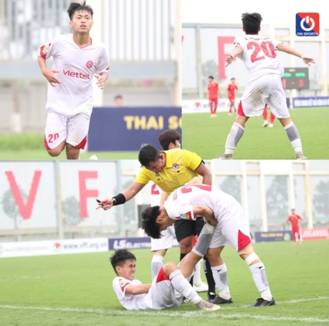 Ngôi sao trẻ của U17 Viettel bị chấn thương bắp chân và không ngừng nhăn nhó. Cuối cùng, Hồng Kiên không thể tiếp tục thi đấu và phải nhờ cáng khiêng ra sân.