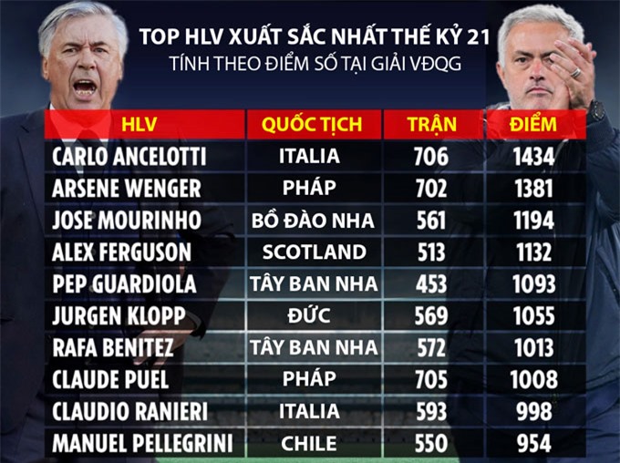 Đứng thứ 2 sau Ancelotti là cựu HLV của Arsenal, ông Arsene Wenger, với 53 điểm ít hơn. Chiến lược gia người Pháp đã có 702 trận dẫn dắt Pháo thủ trong thiên niên kỷ mới và giành 1.381 điểm tại Premier League.