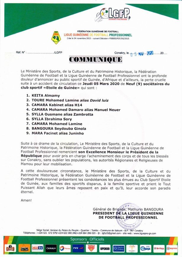 Theo AS, Liên đoàn Bóng đá Guinea đã công bố danh tính của các nạn nhân qua đời trong vụ tai nạn xe bus kinh hoàng ở Guinea. Đáng chú ý, Almamy Keita, em họ của Nabi Keita cũng là một trong những người xấu số.