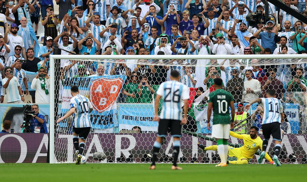 11': VÀO... VÀO... VÀO... 1-0 cho Argentina! Messi dễ dàng hạ gục thủ môn Saudi Arabia trên chấm 11m với cú đá vào góc thấp bên trái. Nhiều CĐV Argentina đã khóc trên khán đài!