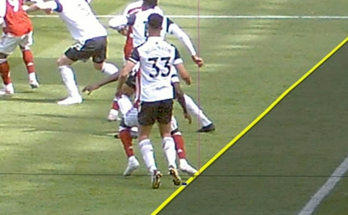 Những nỗ lực của Arsenal suýt chút nữa đem lại kết quả khi ở phút 40, từ đường chuyền tốt của Bellerin bên cánh phải, Ceballos bật cao đánh đầu về góc xa tung lưới Fulham. Tuy nhiên, trọng tài chính lại nhận được tín hiệu từ VAR. Sau khi tham khảo, trọng tài không công nhận bàn thắng của Ceballos. Pha quay chậm cho thấy, Saka trước khi chuyền sang cho Bellerin tạo điều kiện để Ceballos ghi bàn thì đã rơi vào thế việt vị.