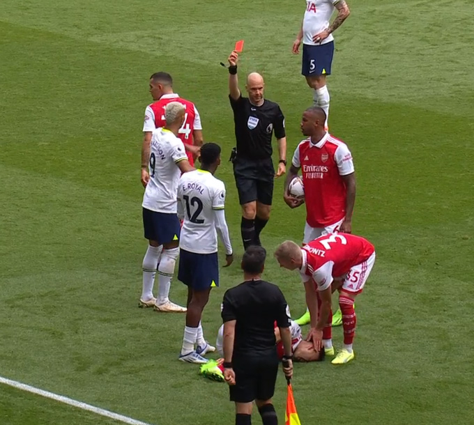 Bị dẫn bàn, Tottenham còn chưa kịp dồn lên tấn công thì đã phải thi đấu thiếu người ở phút 62 do Emerson nhận thẻ đỏ bởi pha vào bóng bằng gầm giày thẳng vào mắt cá chân của Martinelli.