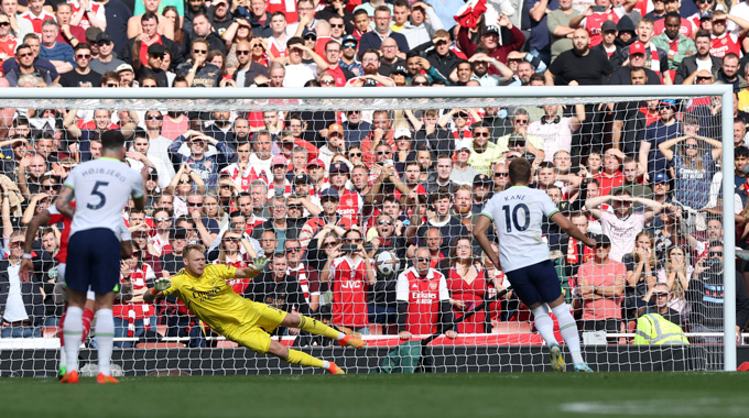 Trọng tài ngay lập tức thổi phạt đền cho đội khách và Harry Kane không mắc sai lầm nào để đánh bại Ramsdale gỡ hòa cho đội khách. Đây cũng là bàn thắng thứ 100 trên sân khách của tiền đạo người Anh, một kỷ lục của giải đấu. 1-1 cũng là tỷ số của hiệp thi đấu đầu tiên.