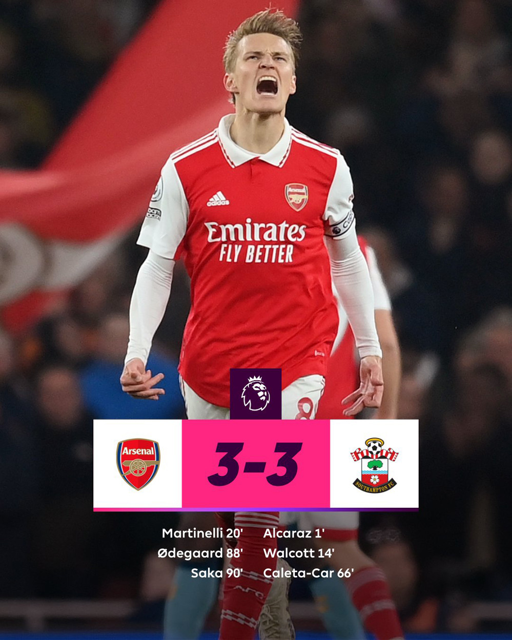 Tưởng như Arsenal phải hứng chịu thất bại khi bị Southampton dẫn 3-1, nhưng hai bàn của Odegaard và Saka lúc cuối trận giúp Pháo thủ có được trận hòa 3-3 kịch tính.
