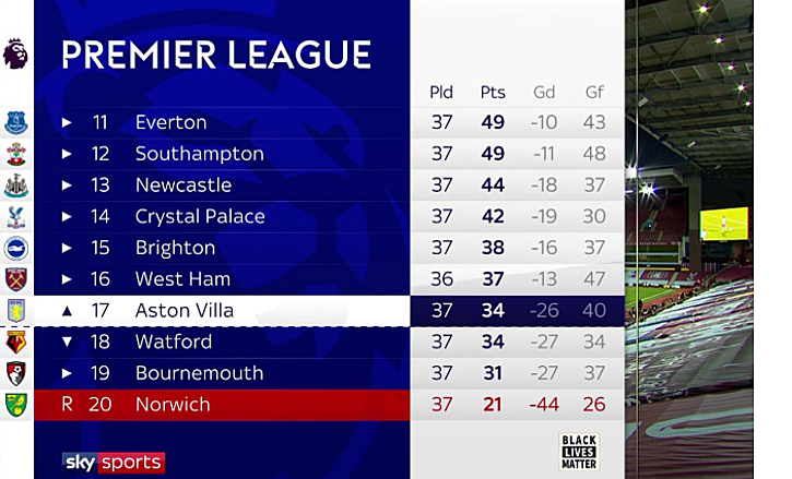 Cục diện cuộc đua trụ hạng trở nên gay cấn sau khi Aston Villa giành ba điểm ở vòng này. Aston Villa và Watford có cùng 34 điểm, còn Bournemouth có 31 điểm. Hai trong ba đội này sẽ xuống hạng cùng Norwich. Aston Villa, đội có lợi thế về hiệu số, sẽ làm khách trước West Ham ở vòng cuối. Watford thì làm khách trên sân Arsenal, trong khi Bournemouth hành quân đến sân Everton.