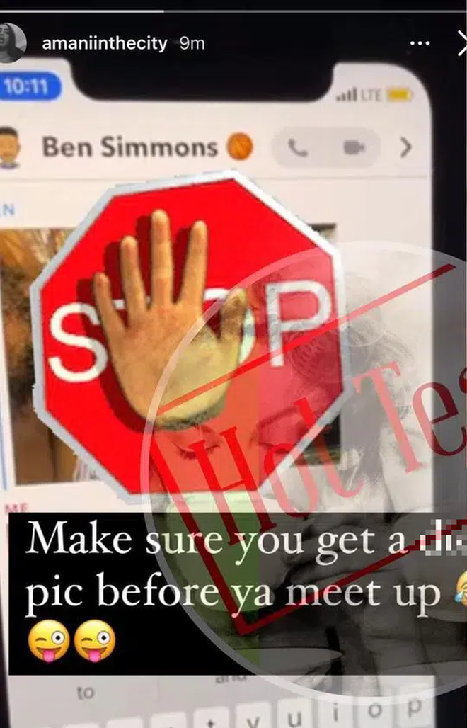 Đáng chú ý, hot girl chuyển giới còn công khai những bằng chứng vô cùng nhạy cảm bao gồm ảnh nóng của Ben Simmons, những đoạn tin nhắn hẹn gặp của 2 người. Amani còn dựa vào một câu nói mập mờ để tố cáo ngôi sao người Úc muốn rủ cô hẹn hò cùng 5 cầu thủ khác của Philadelphia 76ers.