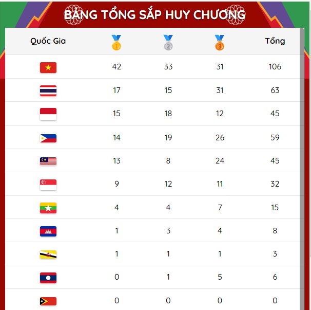 BẢNG TỔNG SẮP HUY CHƯƠNG SEA GAMES 31