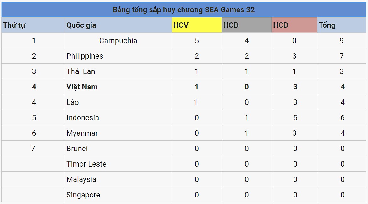 Với thành tích này, Đoàn Thể Thao Campuchia đã bứt tốc ấn tượng ngay ngày đầu tiên trao huy chương để đứng ngôi đầu bảng tổng sắp huy chương SEA Games 32.
