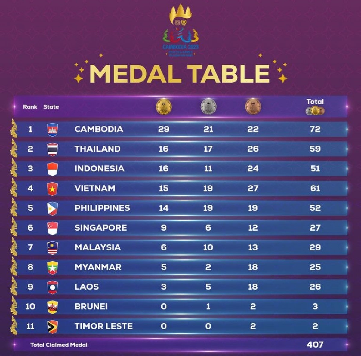 Theo bảng tổng sắp huy chương SEA Games 32 tính đến hết ngày 7/5 do ban tổ chức công bố, chủ nhà Campuchia đang dẫn đầu với 29 HCV, 21 HCV và 22 HCĐ. Đoàn Thể thao Thái Lan có cùng 16 HCV như Indonesia, nhưng xếp trên do hơn về số lượng HCB (17 so với 11).
