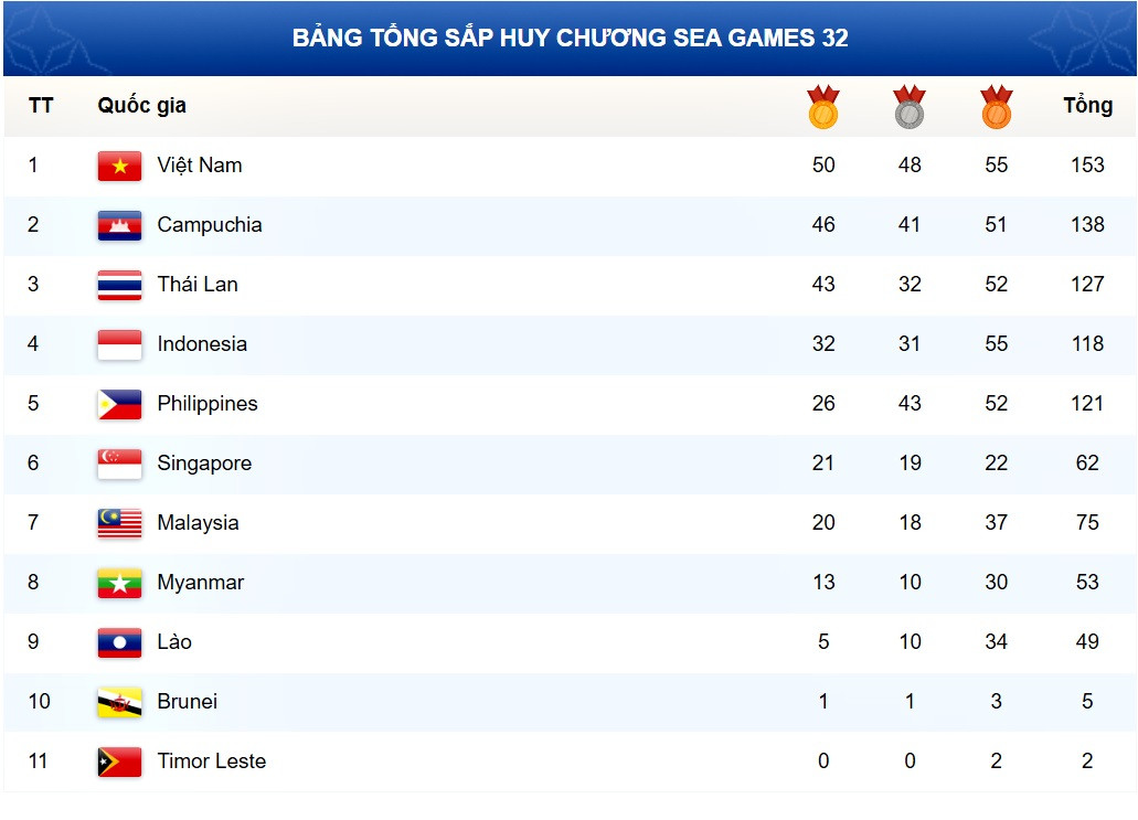 BẢNG TỔNG SẮP HUY CHƯƠNG SEA GAMES 32