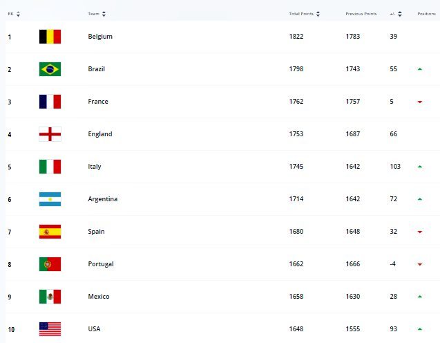 Brazil với việc vào chung kết Copa America đã được cộng thêm 55 điểm để qua mặt Pháp, chiếm vị trí thứ 2.