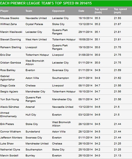 Theo thống kê của trang Dail Mail, tiền vệ Moussa Sissoko của Newcastle đạt vận tốc 35,3 km/h trong trận gặp Leicester City. Hiện tại, đây là cầu thủ thể hiện khả năng bứt tốc tốt nhất Ngoại hạng Anh. Vị trí cuối trong top 10 thuộc về Diego Costa của Chelsea khi đạt 34,7 km/h ở trận đụng độ Liverpool vào ngày 18/10/2014.