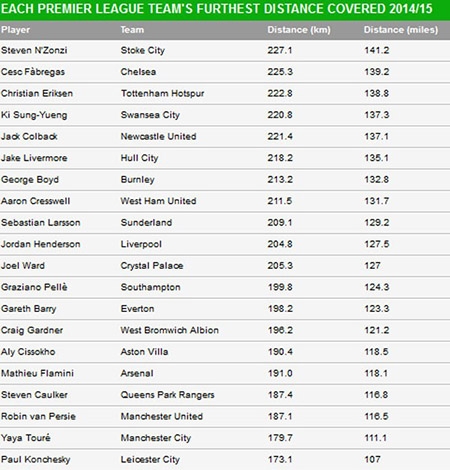 Tính đến thời điểm hiện tại, tiền vệ Steven N'Zonzi của Stoke City di chuyển nhiều nhất với 227,1 km. Vị trí thứ 2 thuộc về Cesc Fabregas của Chelsea khi di chuyển với quãng đường tương đương 225,3 km.