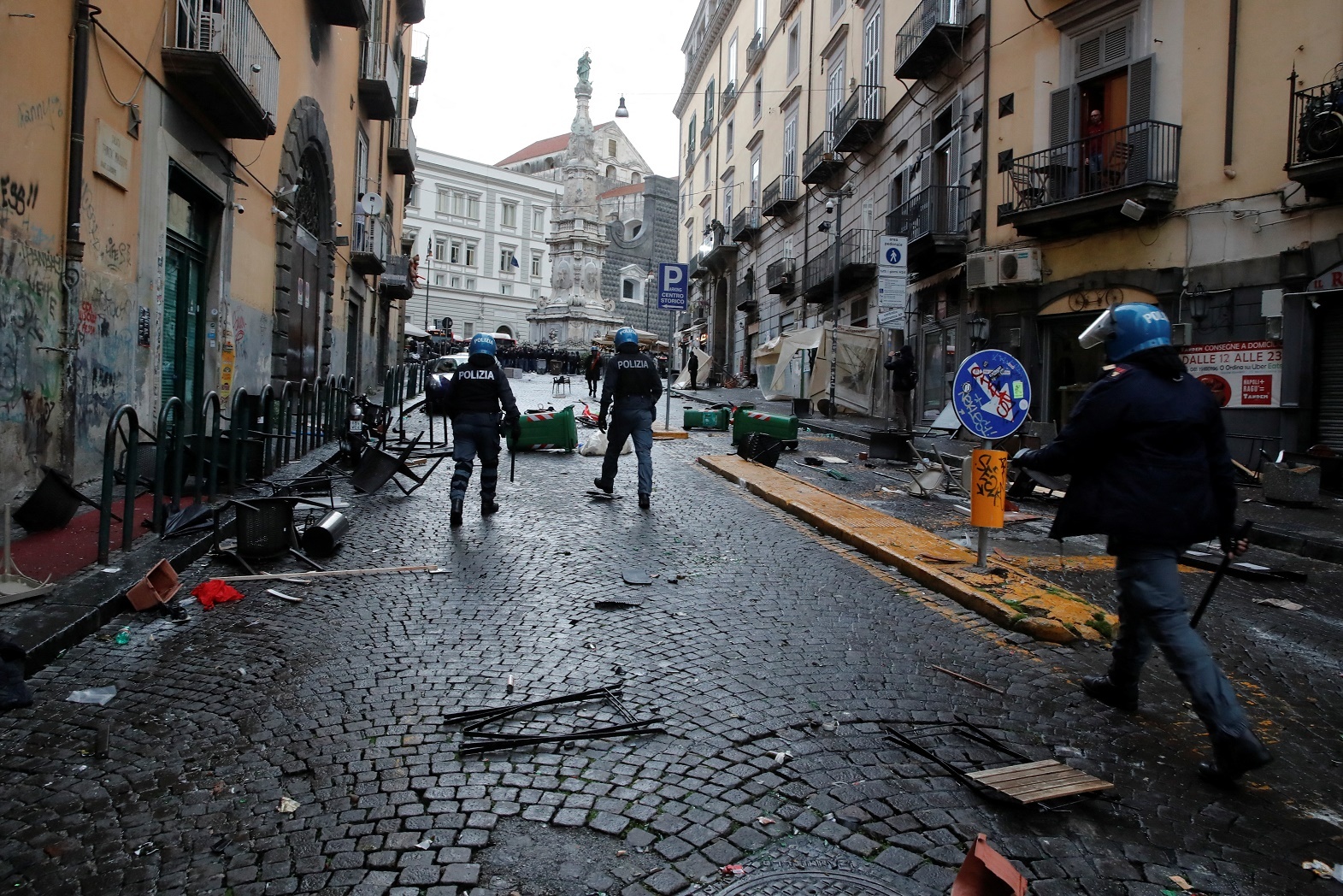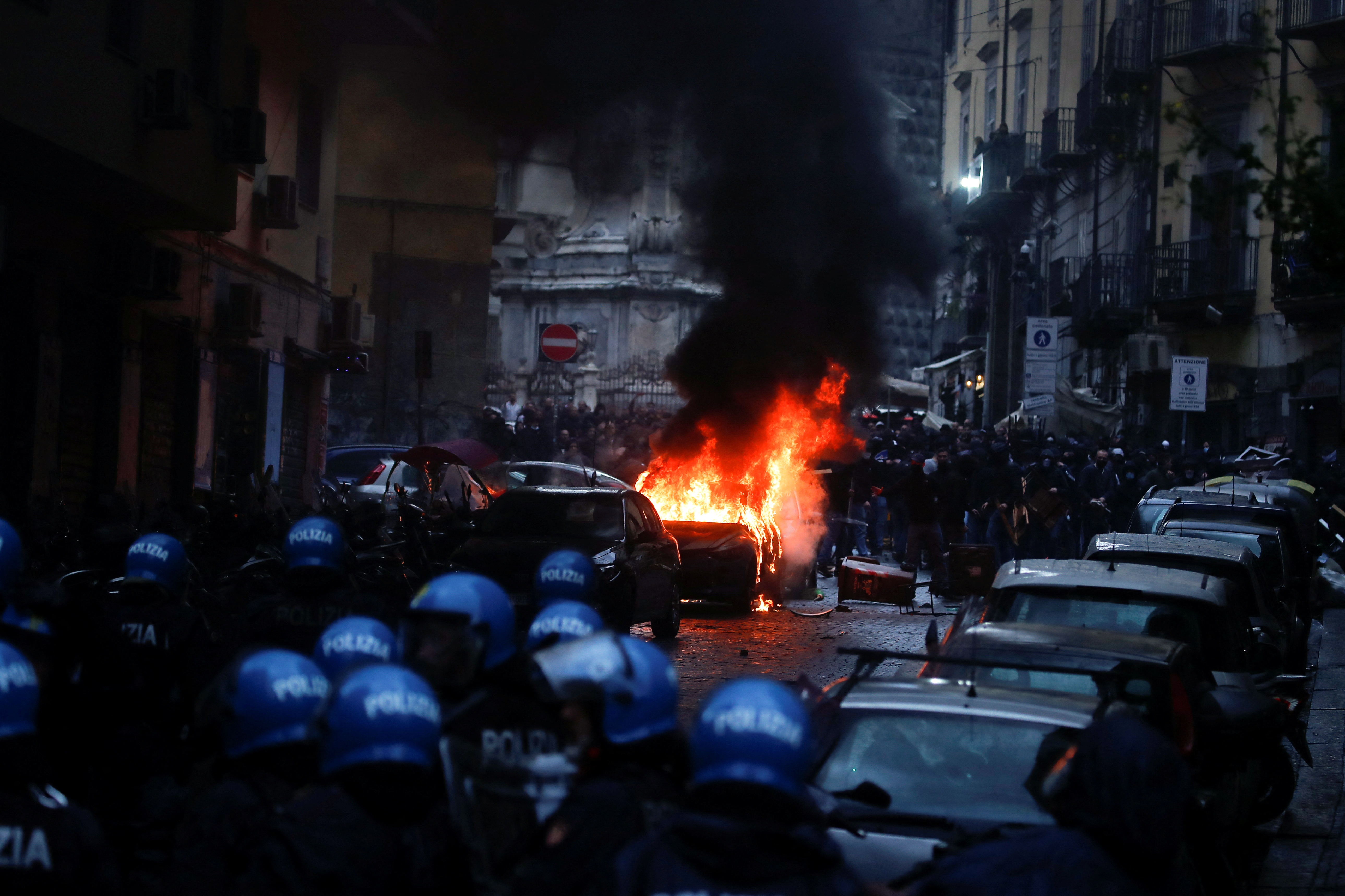 Cuộc bạo động khiến nhiều xe cộ bị đốt phá trên đường phố tại trung tâm TP.Naples. Những kẻ quá khích liên tục ném đất đá, pháo sáng và các vật liệu gây cháy nổ về phía cảnh sát địa phương. Một chiếc xe cảnh sát bị đốt cháy trong khi mảnh vỡ kính xe ô tô vương vãi khắp nơi trên đường phố.