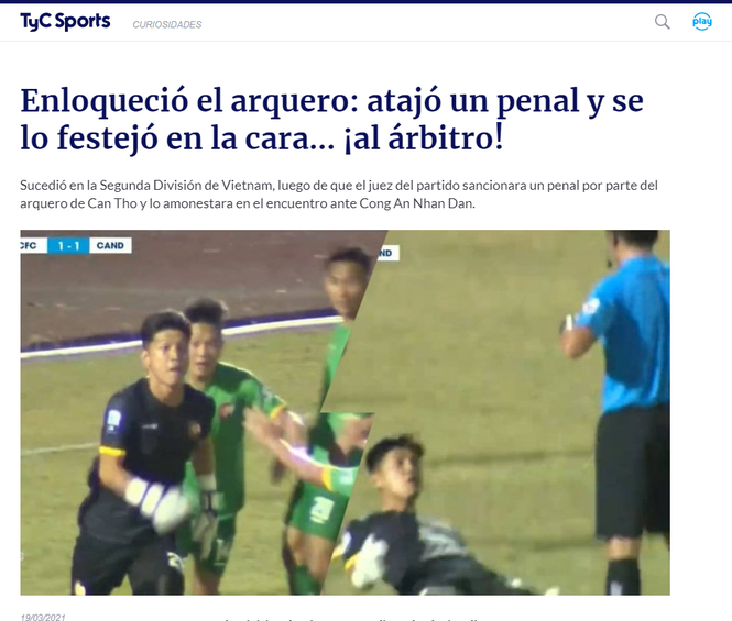"Thủ môn phát điên: Cản phạt đền rồi ăn mừng khiêu khích trọng tài" là tiêu đề bài báo của TyC Sports (Argentina) về tình huống ở giải hạng Nhất Việt Nam. Sau khi cản được phạt đền phút bù giờ, thủ môn Thanh Vũ của Cần Thơ đã lao thẳng về phía vị "vua áo đen" rồi trượt cỏ ăn mừng thách thức.