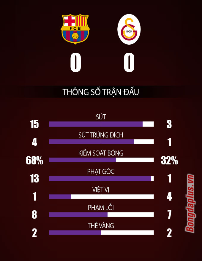 Trước Galatasary ở đẳng cấp thấp hơn, Barca đã làm chủ cuộc chơi ngay sau tiếng còi khai cuộc. Tuy nhiên, dù cầm bóng tới 69% và có số pha dứt điểm cao gấp 3 đối thủ (15 so với 3), Barca lại không sao xuyên thủng được khung thành trấn giữ bởi thủ môn Pena.
