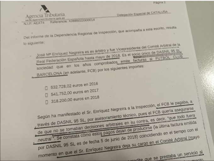 Theo công bố của LĐBĐ Tây Ban Nha, đội bóng xứ Catalunya đã thanh toán 1,4 triệu euro cho công ty DASNIL 95 thuộc sở hữu của Jose Maria Enriquez Negreira từ năm 2016 đến 2018. Phân tích cho thấy các khoản thanh toán xảy ra trong nhiệm kỳ của Josep Maria Bartomeu với tư cách là chủ tịch của Barça.