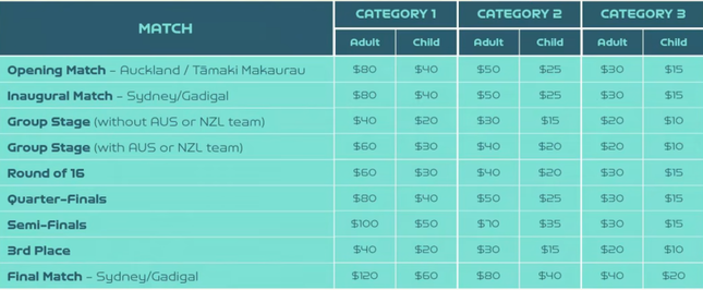 20 đô la là mức giá sàn dành cho vé người lớn. Theo đó, các trận đấu không có hai đội chủ nhà Australia và New Zealand được áp khung giá từ 20-80 đô la Australia/vé cho người lớn và 10-40 đô la/vé cho trẻ em.