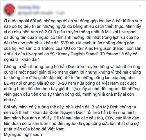 “Bởi vậy mình có ý tưởng thế này, phía khán đài B sân Mỹ Đình chúng ta nên đổi thành “khán đài Đoàn Nguyên Đức” rồi treo hẳn biển như mình làm minh họa ảnh dưới ấy. Để rồi sau này các cầu thủ, CĐV, các lãnh đạo liên đoàn có ra sân luôn nhớ đến người đã góp công sức lớn nhất cho sự phát triển của bóng đá Việt Nam. Mọi người nghĩ sao?”.