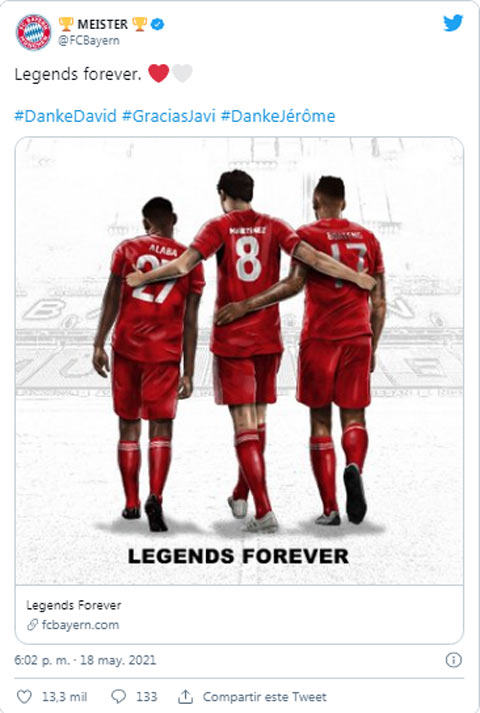 Sau sự chia tay của HLV Hansi Flick, Bayern tiếp tục gửi lời cảm ơn cũng như lời tạm biệt Alaba, Martinez và Boateng. 3 người này sẽ không tiếp tục ở lại Hùm xám vì những lý do khác nhau. "Huyền thoại mãi mãi", trang Twitter chính thức của Bayern viết.
