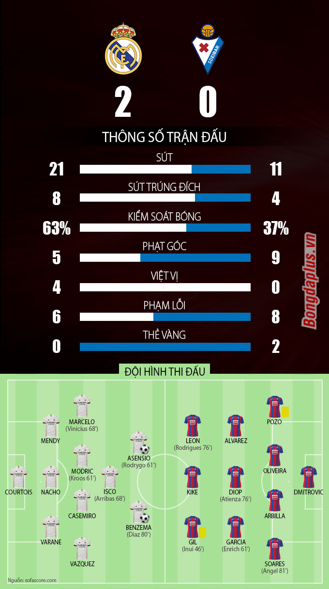 Giữa hiệp 2, Zidane tung thêm Vinicius Junior và Sergio Arribas vào thế chỗ Marcelo và Isco.