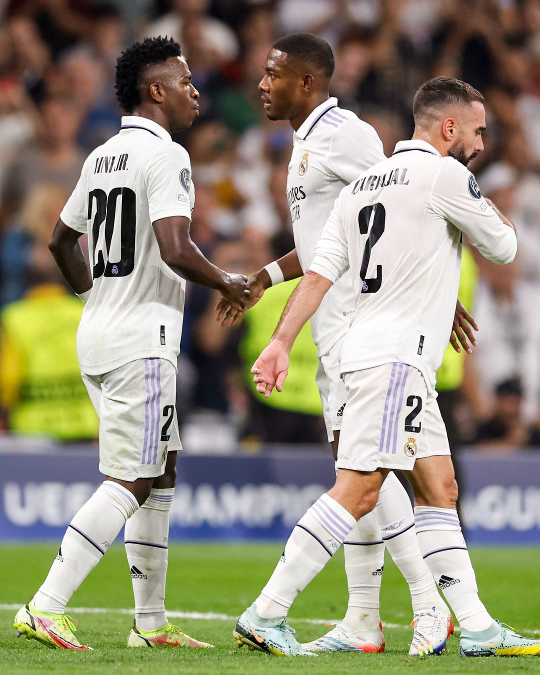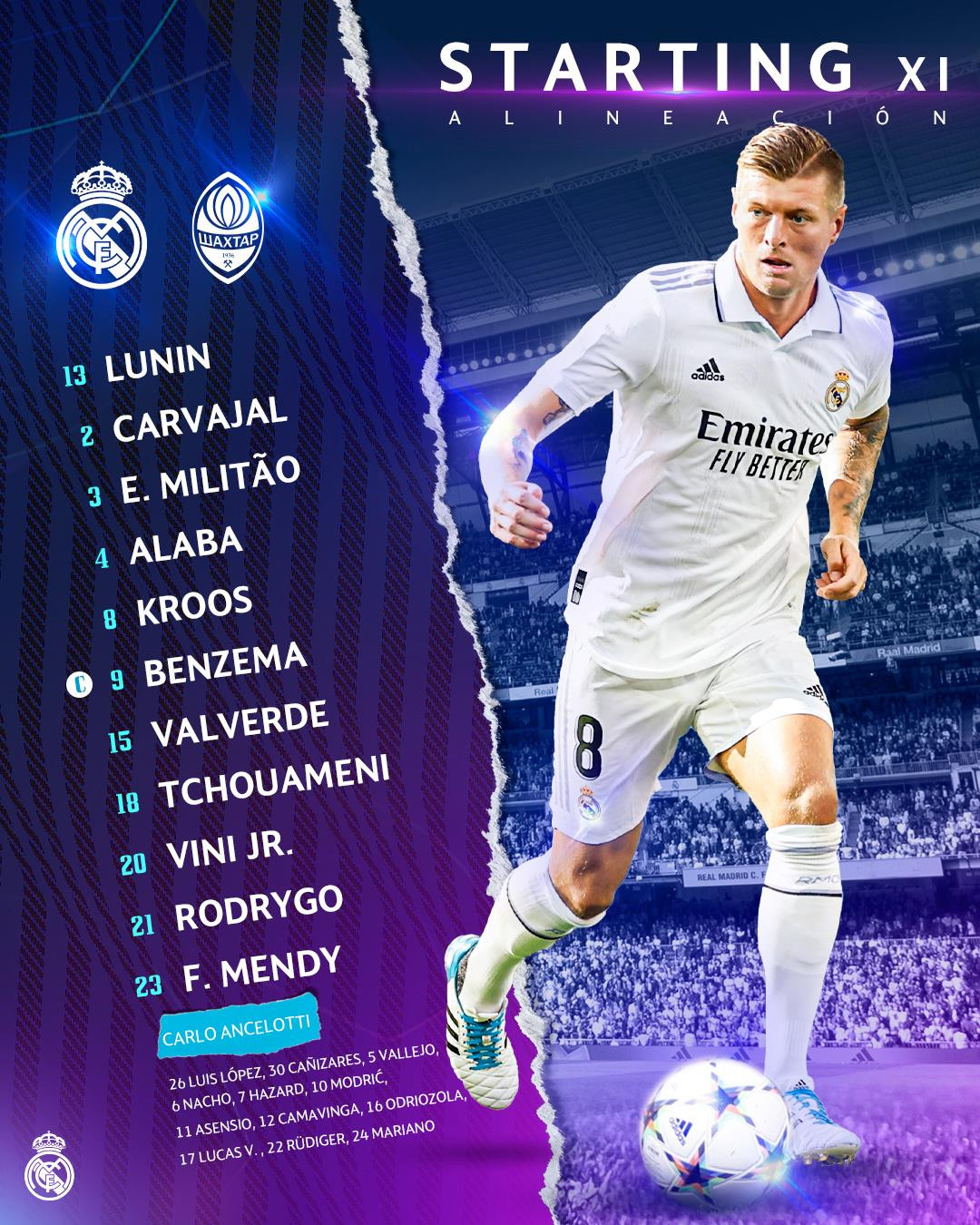 Real Madrid: Andriy Lunin (13), Dani Carvajal (2), Eder Militao (3), David Alaba (4), Ferland Mendy (23), Federico Valverde (15), Toni Kroos (8), Aurelien Tchouameni (18), Rodrygo (21), Karim Benzema (9), Vinicius Junior (20)