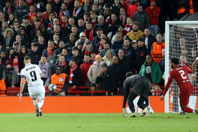 Chỉ 11 phút sau, lại là Benzema ghi tên mình trên bảng tỷ số. Từ một pha phản công quá hay của Real, tiền đạo người Pháo đi bóng qua cả thủ thành Alisson rồi dễ dàng sút tung lưới Liverpool.