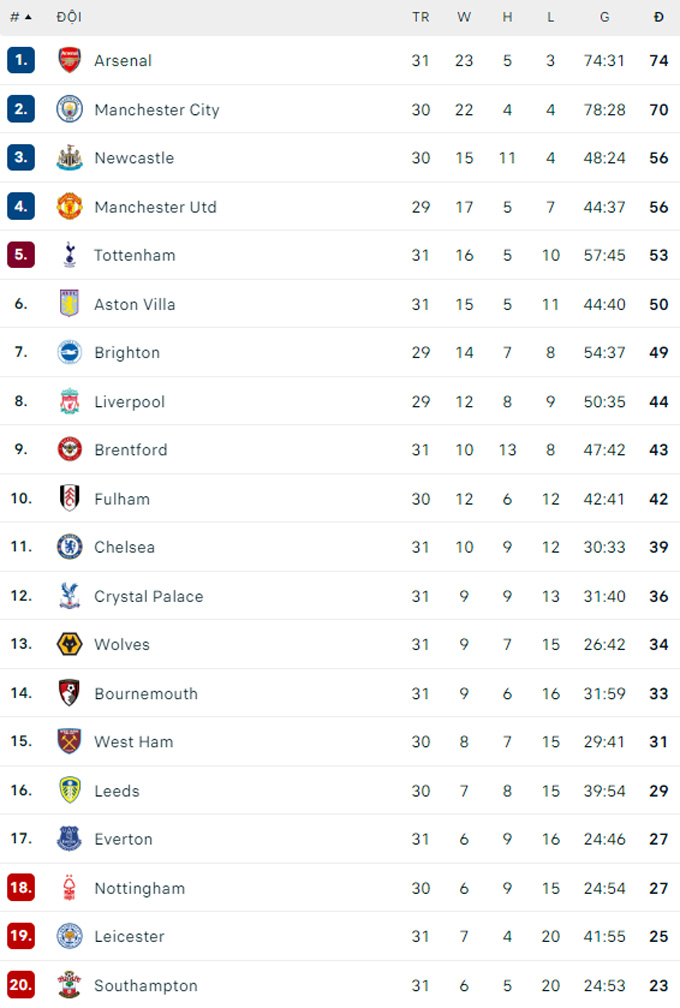 Ở vòng 32, Arsenal sẽ tiếp đón Southampton trước khi có "trận chung kết" với Man City ở vòng 33 hôm 27/4. Với tình hình hiện tại, Pháo thủ đang thực sự lâm nguy bất chấp vẫn giữ được ngôi đầu.