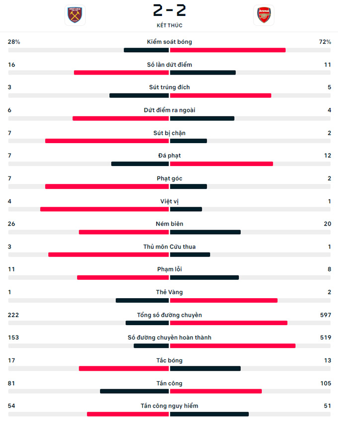 Ở quãng thời gian còn lại, Arsenal dốc toàn lực tấn công nhưng bế tắc toàn tập trước hàng thủ kín kẽ của West Ham. Thậm chí, họ suýt chút nữa phải nhận bàn thua thứ ở phút 82, khi Antonio đánh đầu đưa bóng chạm điểm nối giữa cột dọc và xà ngang cầu môn Ramsdale. Chung cuộc, Arsenal hòa West Ham 2-2. Kết quả này khiến Arsenal chỉ còn hơn Man City có 4 điểm song đá nhiều hơn đối thủ 1 trận.