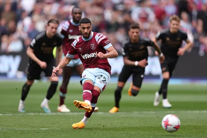 Lợi thế lớn chóng vánh khiến Arsenal chùng xuống thay vì cố gắng nghiền nát con mồi ngay trong hiệp 1. Đoàn quân của HLV Mikel Arteta chủ động cầm chắc bóng nhằm hạn chế khả năng lên bóng của West Ham, nhưng cách tiếp cận này đã phản tác dụng. Phút 32, tiền vệ Lucas Paqueta bị trung vệ Gabriel Magalhaes đốn ngã rõ ràng trong vòng cấm. Trên chấm 11 mét, tiền đạo Said Benrahma không mắc sai lầm nào đánh lừa thủ thành Aaron Ramsdale rút ngắn tỷ số xuống 1-2 cho West Ham.