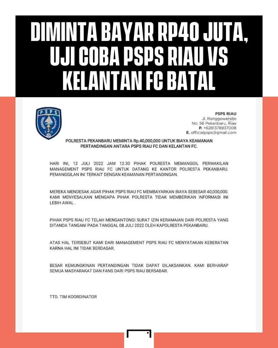 Tuy nhiên vào phút chót, CLB Kelantan đã bất ngờ thông báo hủy trận đấu này khiến các CĐV ngỡ ngàng. Lí do mà đội bóng của Malaysia đưa ra đó là cảnh sát Pekanbaru, nơi diễn ra trận đấu, đã yêu cầu Kelantan phải trả một khoản tiền coi như phí "bảo vệ".