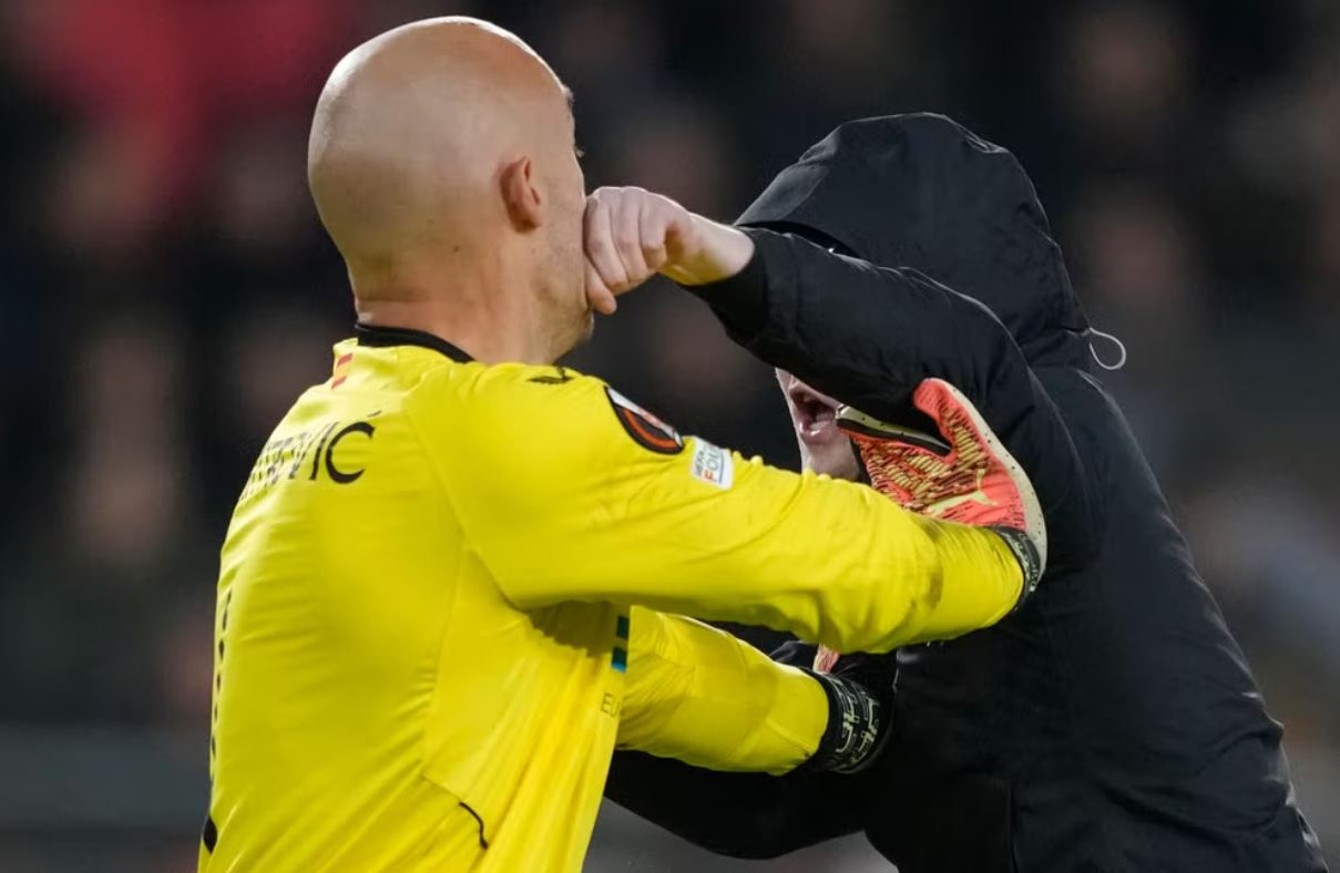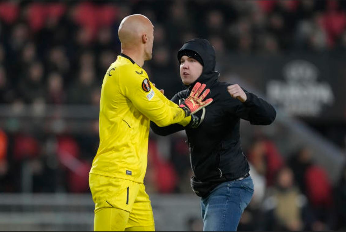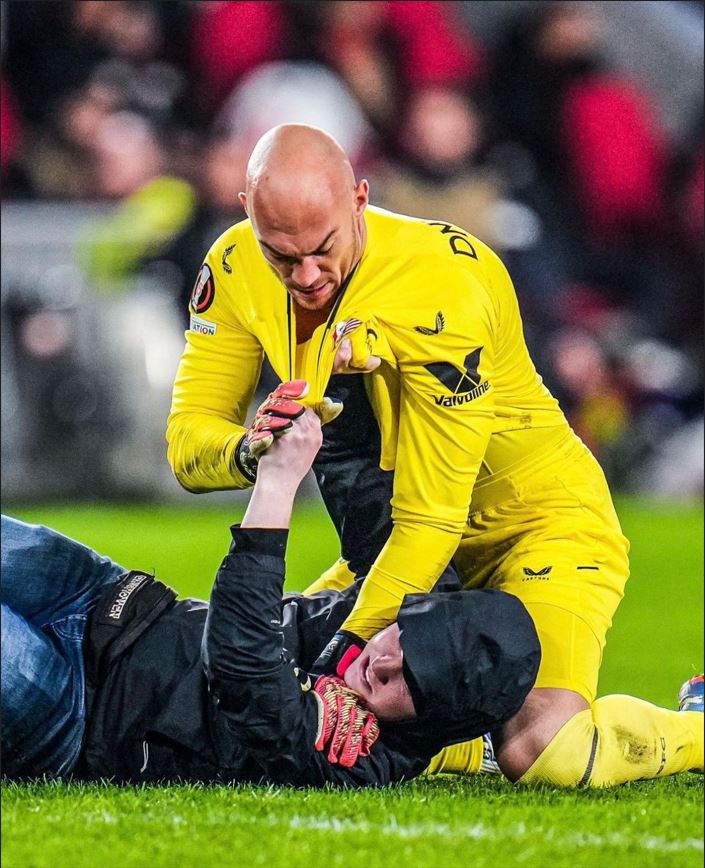 Marko Dmitrovic đang bắt chính cho Sevilla trong trận play-off Europa League với PSV thì một tên côn đồ tiếp cận anh.