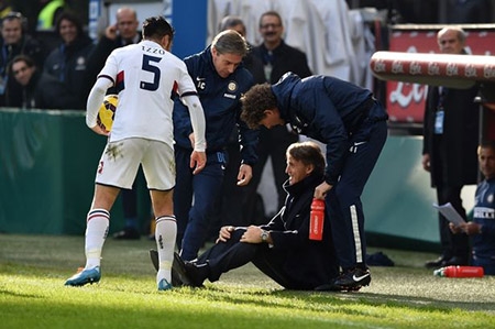 Đó là pha bóng diễn ra ở phút 67 trận Inter Milan tiếp Genoa ở vòng 18 Serie A đêm qua. Sau nỗ lực phá bóng trước sự đeo bám của cầu thủ khách, Marco Andreolli đã vô tình sút bóng trúng mặt ông thầy Robert Mancini.