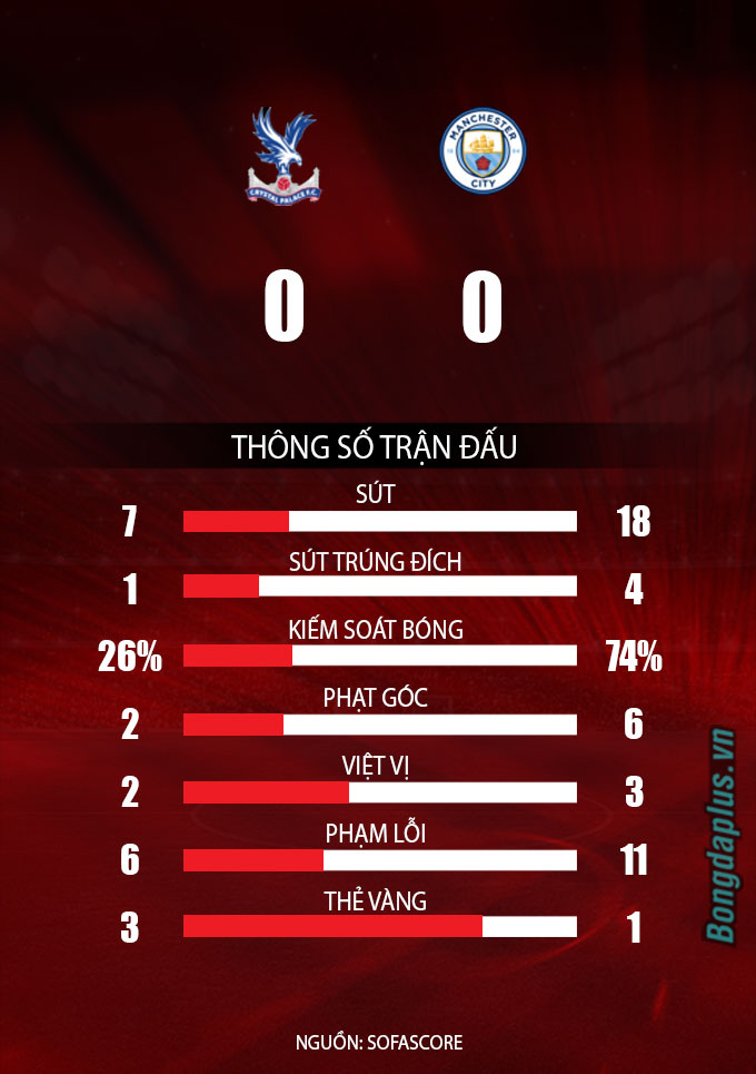 Chung cuộc, Man City bị Palace cầm hòa 0-0. Đây là lần thứ 2 ở mùa giải này, Palace khiến thầy trò Guardiola không thể ghi bàn. Ở lượt đi tại Etihad, The Eagles thậm chí còn hạ đo ván Man xanh 2-0.
