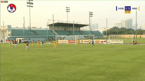 Phút 72, thời điểm trận đấu đang có tỷ số hòa 1-1, trọng tài cho Hà Nội FC được hưởng quả phạt đền khi xác định cầu thủ HAGL dùng tay chơi bóng trong vòng cấm.