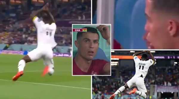 Phấn khích vì ghi bàn thắng đầu tiên trong sự nghiệp tại World Cup, Osman Bukari lập tức copy pha ăn mừng của Ronaldo. Cụ thể, ngôi sao 23 tuổi dang rộng 2 tay, giậm nhảy và hét lớn “Siuu”. Đây là pha ăn mừng mang thương hiệu riêng của CR7.