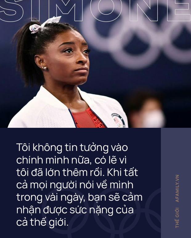Vận động viên (VĐV) 24 tuổi này, từng 4 lần giành HCV ở Olympic Rio 2016 tiết lộ rằng cô bỏ dở cuộc tranh tài vì lo lắng cho sức khỏe tinh thần của mình. Simone Biles cho biết: "Tôi phải tập trung vào sức khỏe tinh thần của mình. Tôi không muốn ra ngoài đó, làm điều gì đó ngu ngốc và bị thương. Tôi không muốn được đưa ra khỏi nhà thi đấu trên cáng".