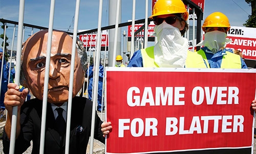 | Một nhóm người biểu tình, kêu gọi FIFA phế bỏ Blatter, ngay bên ngoài hội trường nơi diễn ra phiên họp Đại hội đồng FIFA tại Zurich. Ảnh: Reuters. |