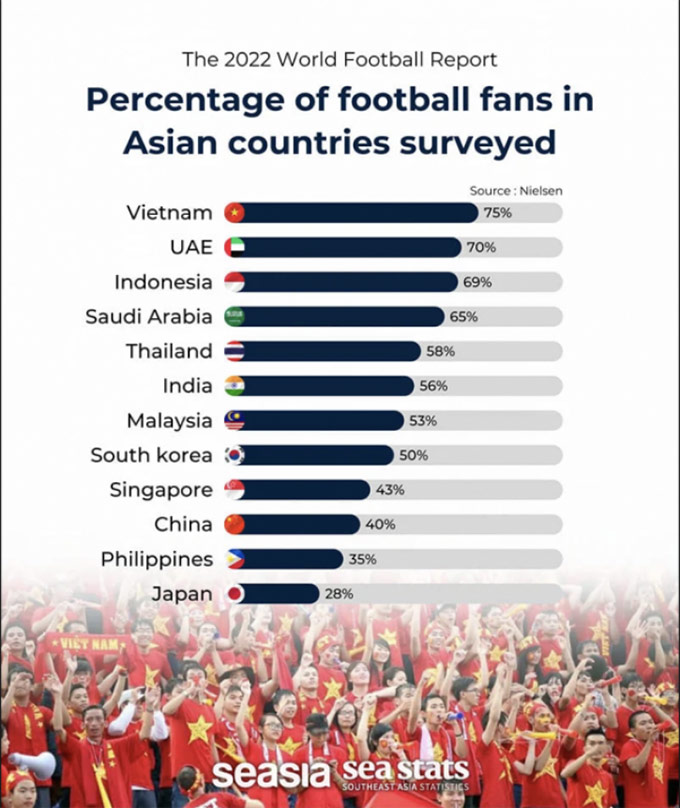 Theo thống kê của trang Nielsen xoay quanh tỷ lệ người hâm mộ bóng đá thế giới nói chung và châu Á nói riêng, khu vực Đông Nam Á đóng góp tới 6 quốc gia có số lượng fans đông đảo trong top 12 châu lục. Cụ thể, bóng đá Việt Nam đạt tỷ lệ người hâm mộ lên tới 75%, qua đó đứng số 1 châu Á.