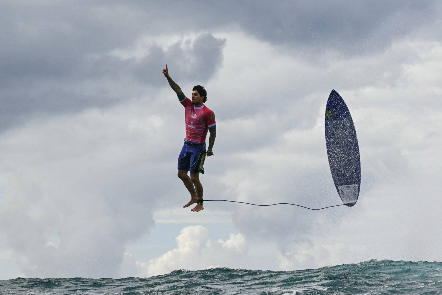 Gabriel Medina - người đàn ông 30 tuổi đến từ Sao Sebastiao, Brazil - ngôi sao hàng đầu về lướt sóng, bay trên bầu trời Thái Bình Dương và chỉ tay lên trời.