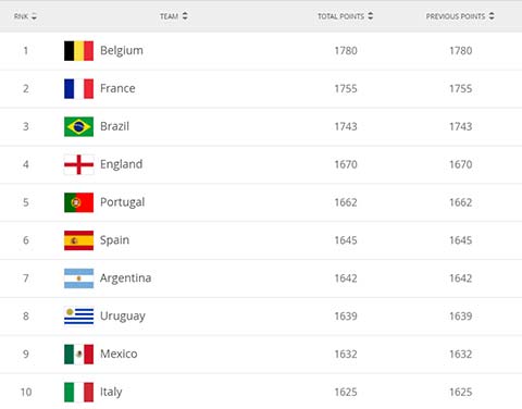 Quay lại với nhóm siêu cường thế giới. Bỉ tiếp tục giữ vị trí số 1 với tổng điểm 1780. Xếp sau Bỉ là một loạt các đại gia quen mặt khác như Pháp, Brazil, Anh, Bồ Đào Nha, Tây Ban Nha, Argentina...