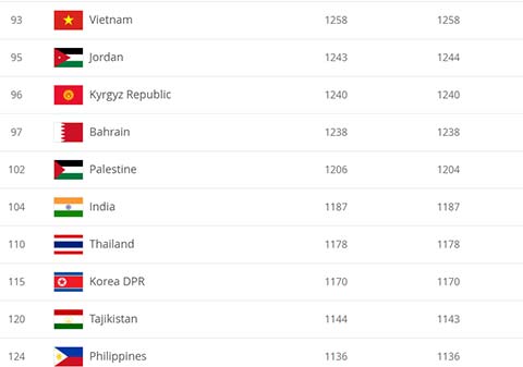 Đến với khu vực châu Á, ĐT Việt Nam do không thi đấu nên vẫn giữ nguyên 1258 điểm, đứng thứ 93 thế giới. Thầy trò Park Hang Seo vẫn là đội bóng mạnh thứ 14 châu Á, và số một khu vực Đông Nam Á, bỏ xa Thái Lan (110), đội tuyển đứng thứ hai và tăng 1 bậc so với tháng trước. Xếp sau là Philippines (124), Myanmar (137), Malaysia (153)...