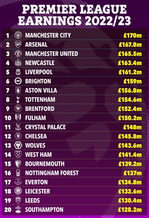 Trong khi đó, Liverpool và Chelsea phải trả giá đắt do nằm ngoài top 4 và lỡ Champions League, giải đấu sẽ mang lại cho họ khoảng 100 triệu bảng ở mùa tiếp theo.