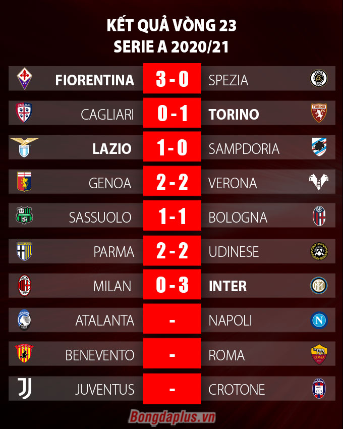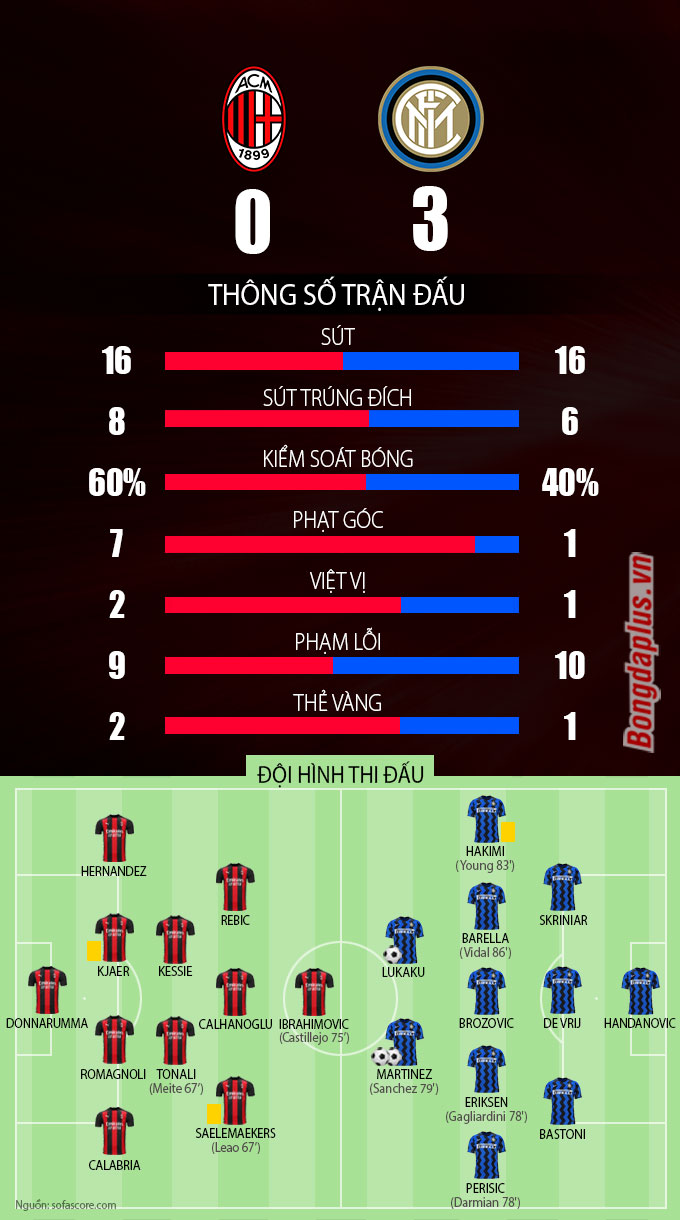 Kết quả cuối cùng trận Milan vs Inter, đội khách giành chiến thắng chung cuộc với tỷ số 3-0. Thắng trận, Inter tiếp tục giữ vững vị trí số 1 trên BXH Serie A 2020/21 với 53 điểm còn Milan xếp thứ 2 khi có 49 điểm.