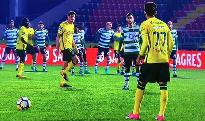 Khi đó, Hendrio mặc áo số 77 của Pacos Ferreira chuẩn bị thực hiện quả đá phạt. Người đứng làm nhiệm vụ hàng rào bên phía Sporting chính là Bruno Fernandes. Phía sau bức ảnh còn có Jeremy Mathieu, cựu hậu vệ Barca khi đó đang đá cho Sporting.